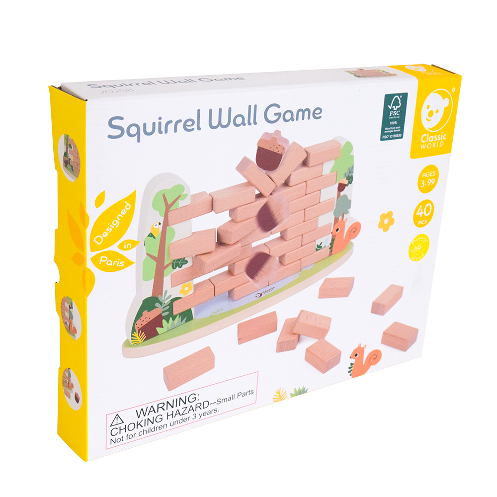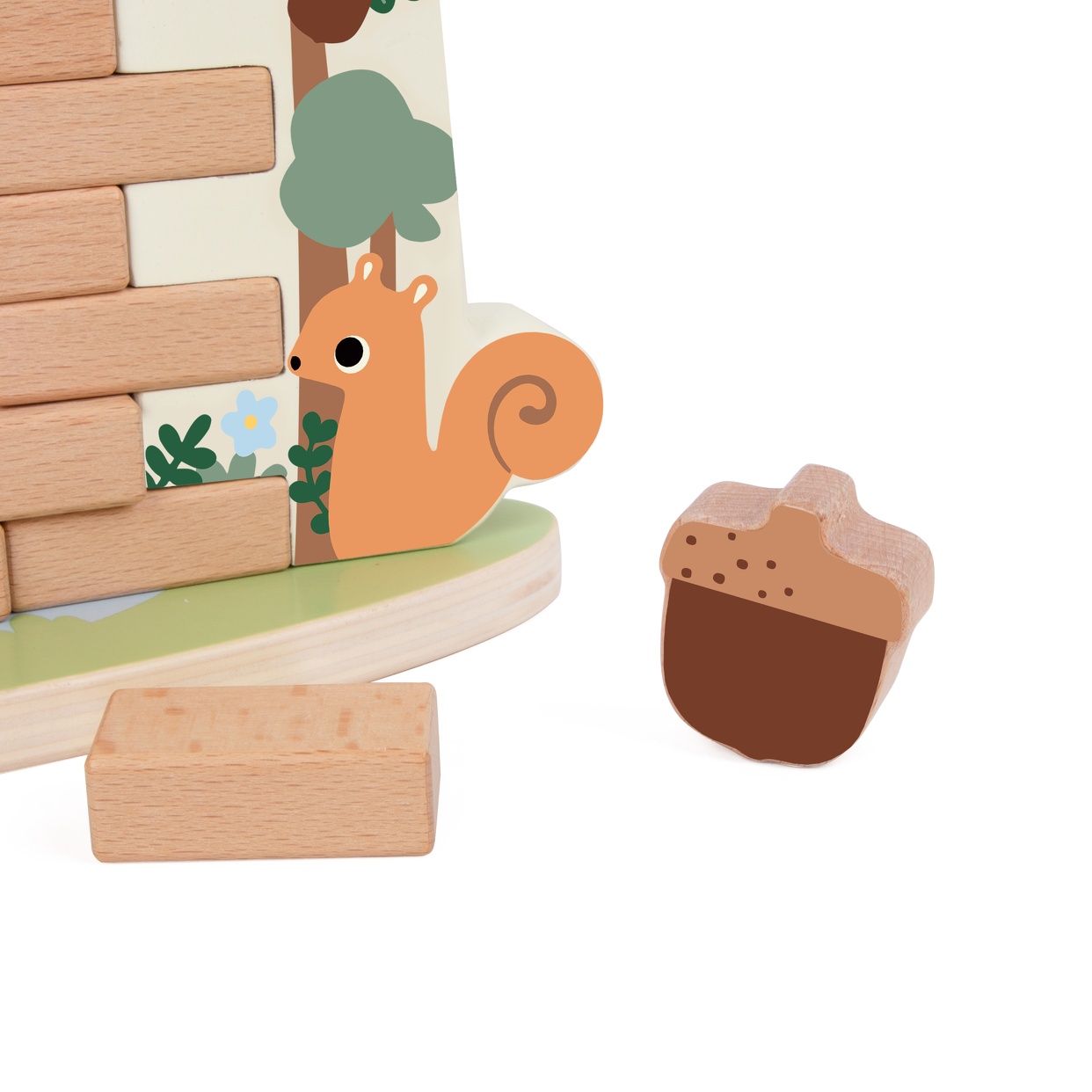 てっぺんに置いたドングリを落とさないようにブロックを引き抜いていくバランスゲームです。 子どもから大人まで楽しめます。