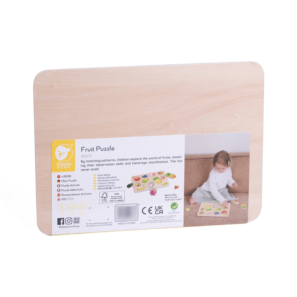 果物が描かれた11ピースの型はめパズルです。 台座には果物の断面がヒントとして描かれています 手指の器用さや集中力を養います。