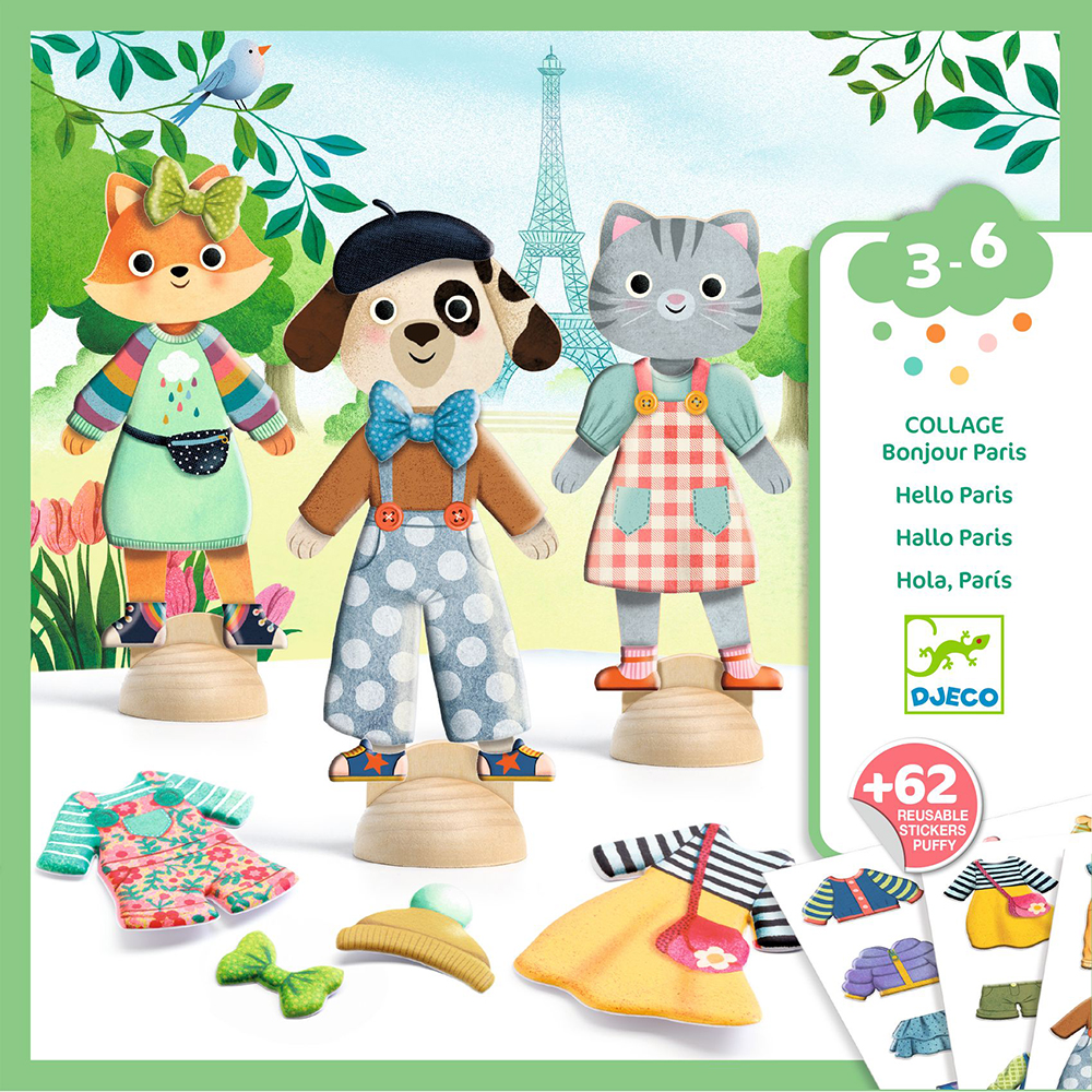 パリの街並みを背景に、3匹の動物さんをおしゃれに着せ替えて遊べるセットです。 3枚のシーンと62種類のお洋服シールが入っており、貼ってはがせるので何度でも着せ替えOK。 自由な組み合わせでファッションを楽しみながら、創造力や色彩感覚、手先の器用さを育む知育遊びです。